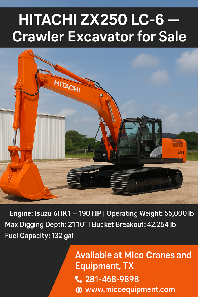 Contact Mico Cranes and Equipment, TX, to purchase second-hand heavy machinery for mining, earthmoving, and construction operations. Our ZX250LC-6 excels in the market with comparable power, precision, and durability to other brands’ models with similar specifications.