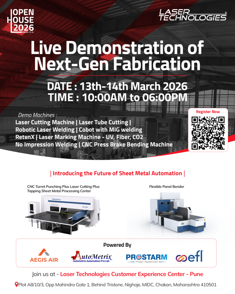 Laser Technologies Pvt. Ltd. cordially invites you to experience the future of fabrication and automation at our Exclusive Open House & Technology Launch 2026. Join us for a day of innovation, live demonstrations, and expert interactions at our Customer Experience Centre in Pune. Date: 14 March 2026 Time: 10:00 AM – 6:00 PM Venue: Customer … The post Laser Technologies Open House 2026 in Pune appeared first on Machine Insider.