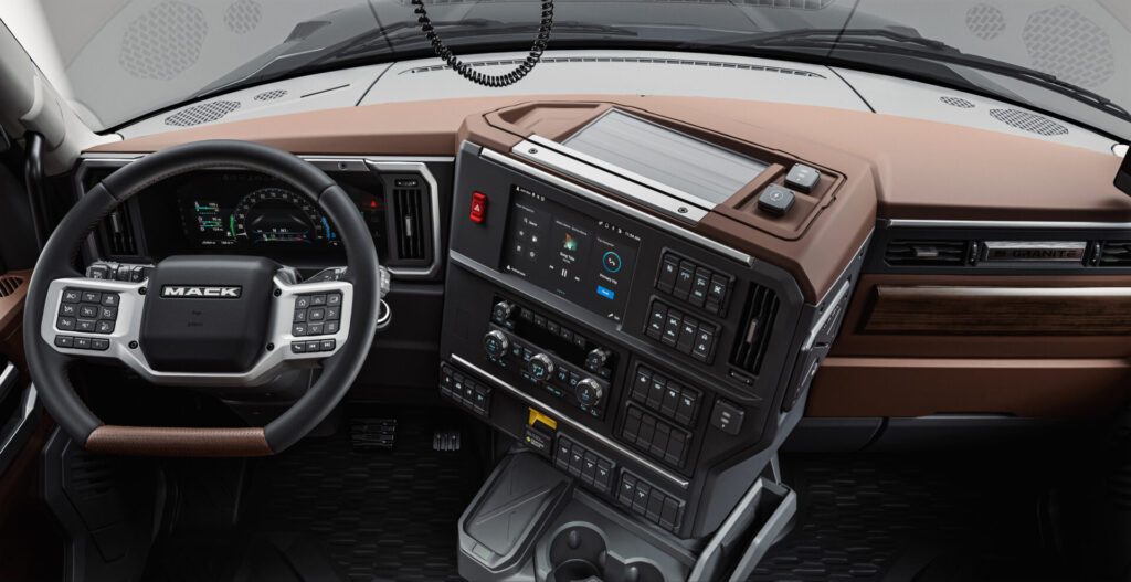 Inside, the Granite’s cab layout was developed based on driver feedback gathered during an evaluation clinic at Virginia Tech. The result is a driver-focused control layout, new digital instrumentation, and a set of “workday” features such as reinforced mounting points for devices, multiple power outlets including dual USB-C, and a bodybuilder tower between the seats for mounting vocational controls and gauges.