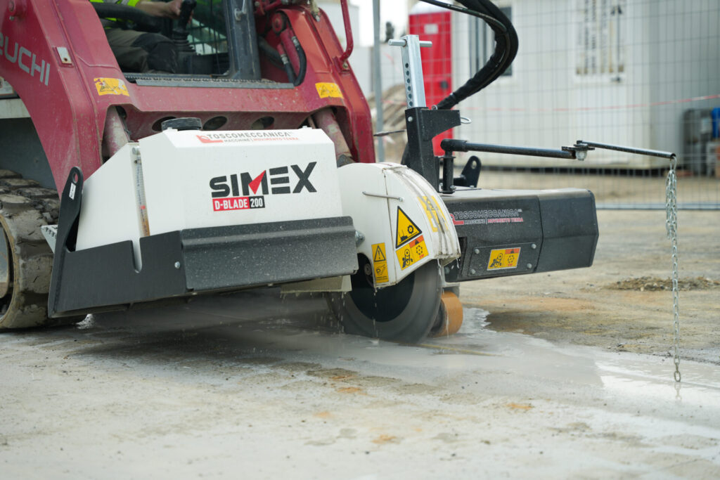 For cutting applications, Simex is putting forward the D-BLADE equipment within the SaMoTer Innovation Award framework, centred on the D-BLADE 200. The attachment is designed for concrete and asphalt cutting, with reported cutting depth up to 220 mm and a wet-cutting setup that includes an integrated 120-litre water tank to control dust and manage blade temperature.