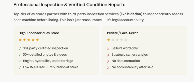 Buying used compact machinery — especially online — requires confidence in the machine's actual condition. A worn undercarriage, a hydraulic leak, or a failing engine can turn a bargain into a money pit. This is where high-feedback eBay Stores separate themselves from the pack.