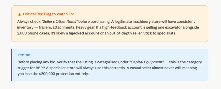 This level of protection is simply not available when buying from a private individual on Facebook Marketplace, Craigslist, or a regional auction with no returns policy. High-feedback eBay Stores that specialize in compact machinery consistently list in the correct "Capital Equipment" categories, which is what triggers BEPP coverage. Inexperienced or casual sellers rarely do this correctly — meaning buyers lose access to the protection entirely.